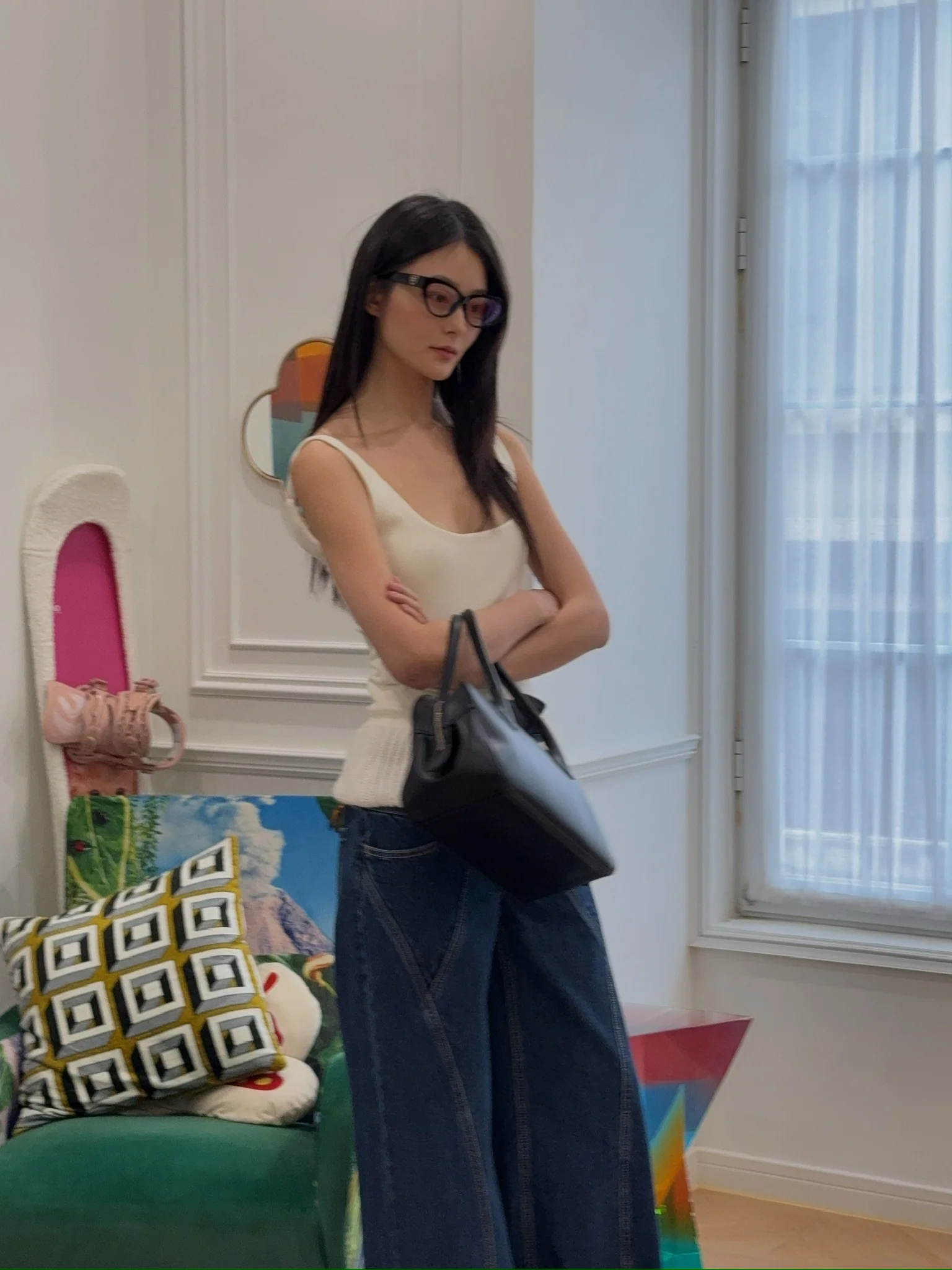 The Keo tank in ecru is a wide jersey rib top with a scoop neck at both the front and back. It has a wide chunky knit hem and is designed to fit close the body