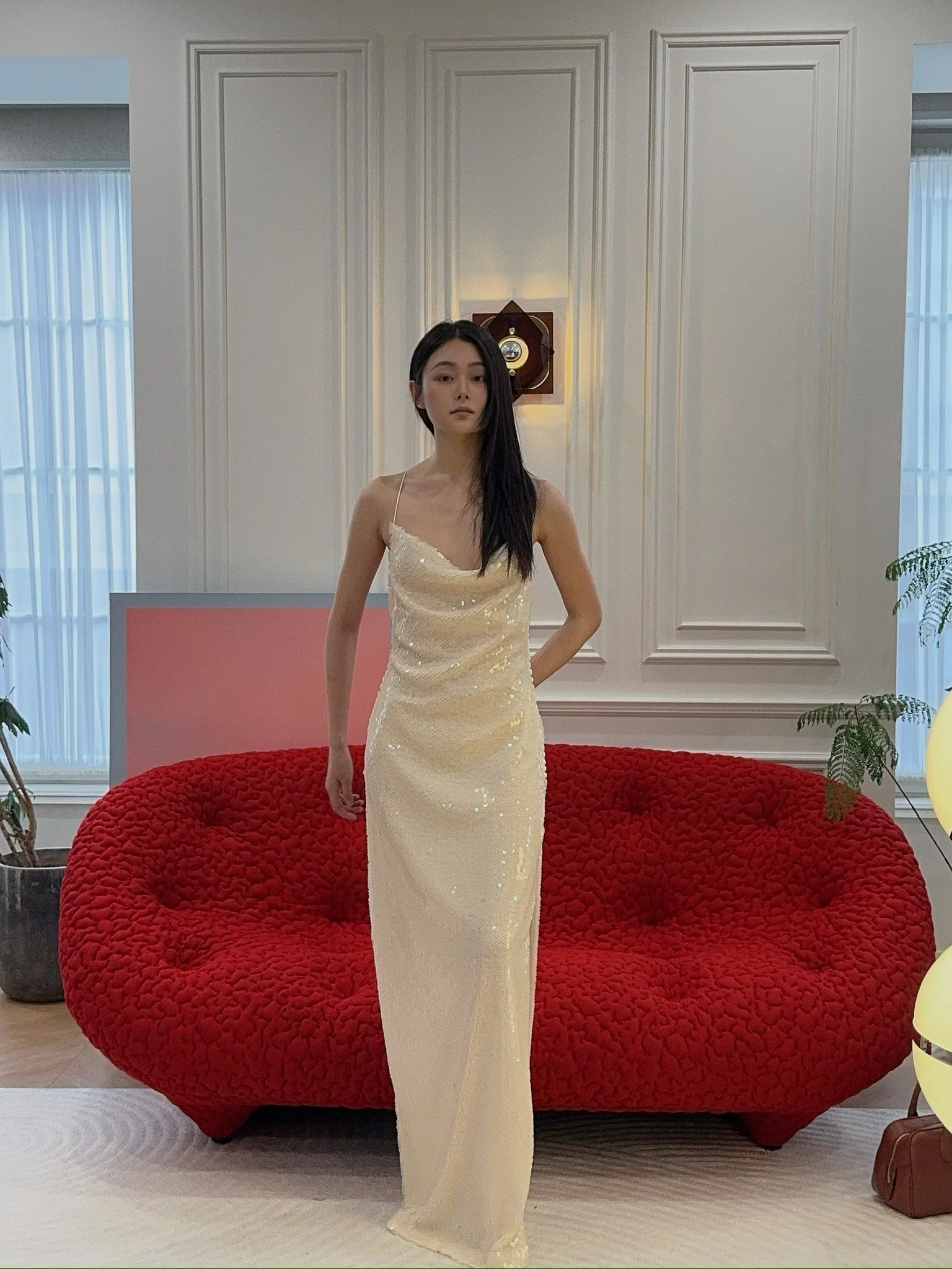 MAGDA BUTRYM Sequin spaghetti strap gown in cream